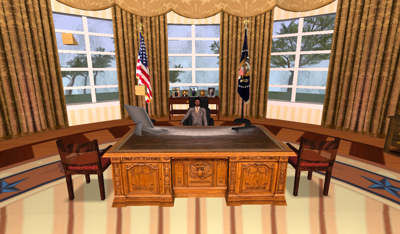 Plus sitting in the white house has plenty of perks Second Life never has any problems running on the white house computer after all. Plus I like to keep my nuclear suitcase near by just in case I want to start a needless war. Just remember if you vote for me for another 4 years I promise a pie in everyone refrigerator, just ignore my plans of world domination as well as my other policies I plan to not follow through on.